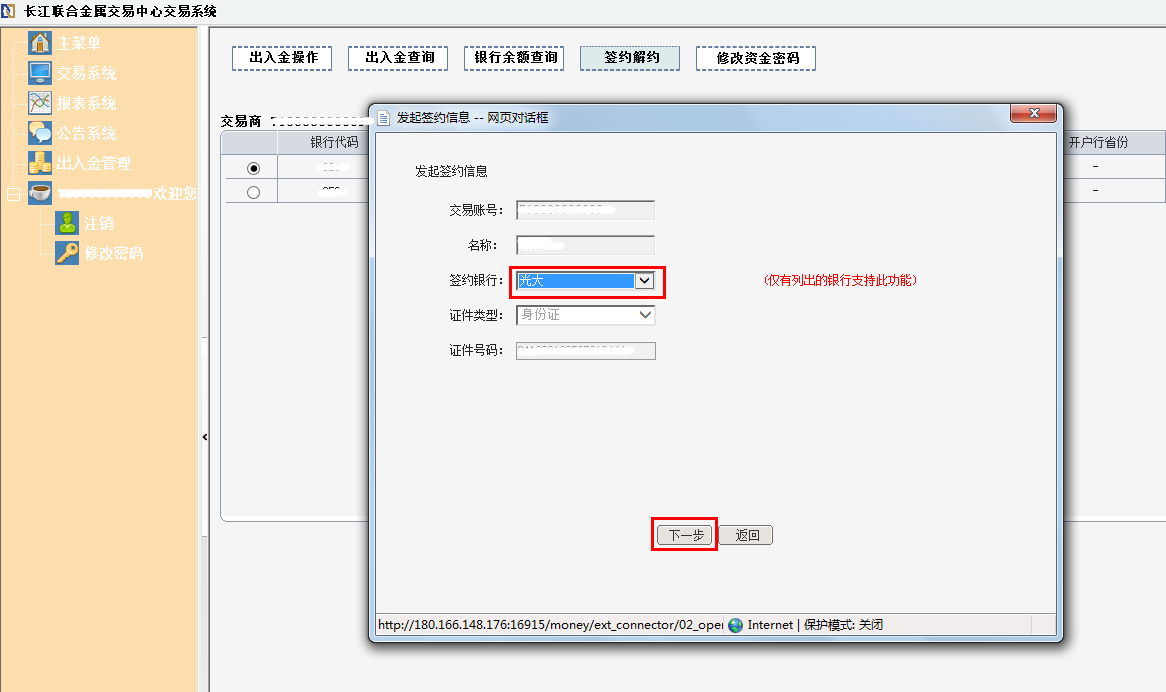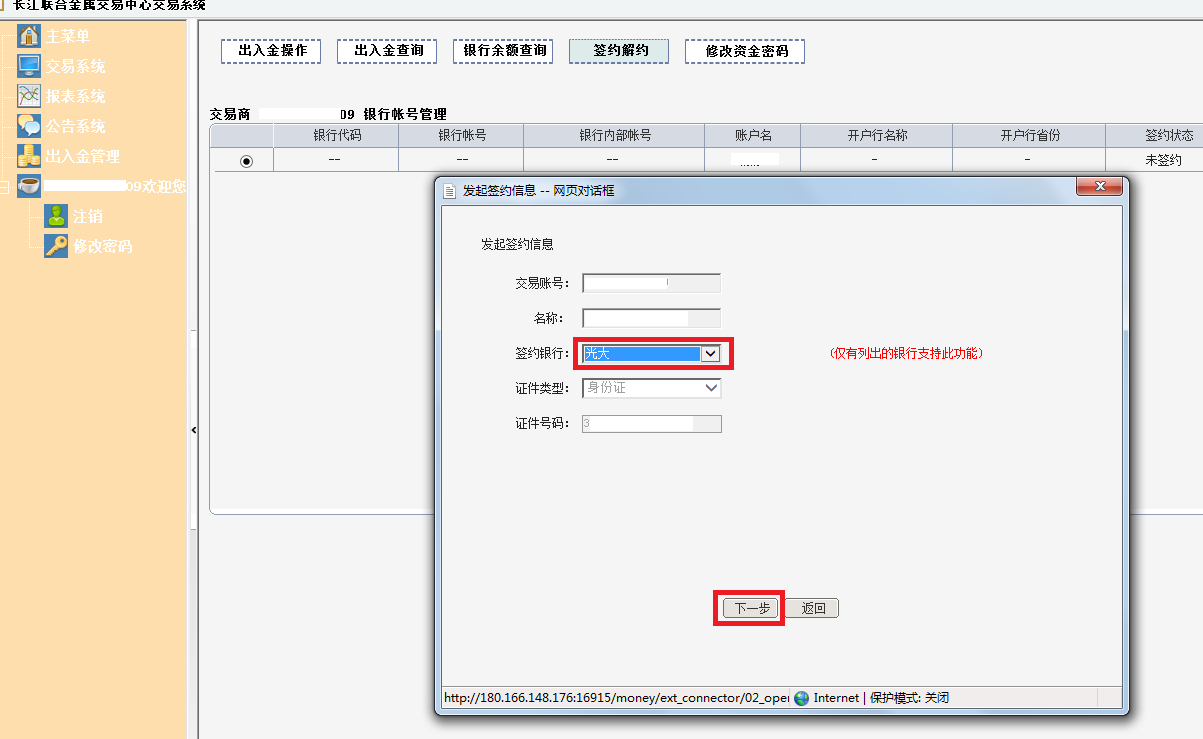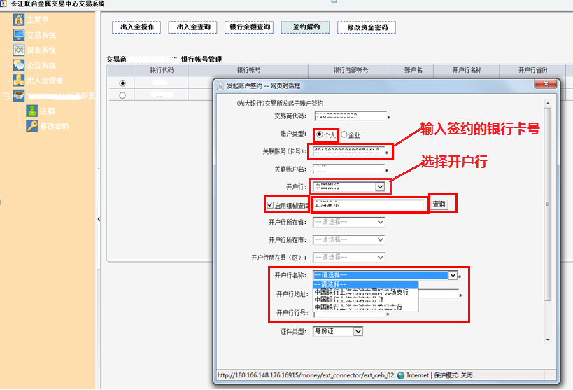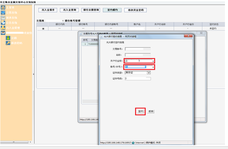 四、在弹出的对话框中,输入光大开户行全称和光大银行的卡号,点击“签约”按钮。
