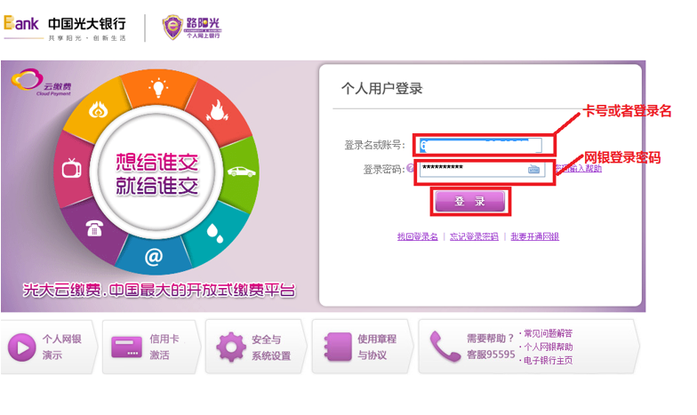七、输入光大卡号或者登录名,网银登录密码,点击“登录”按钮。