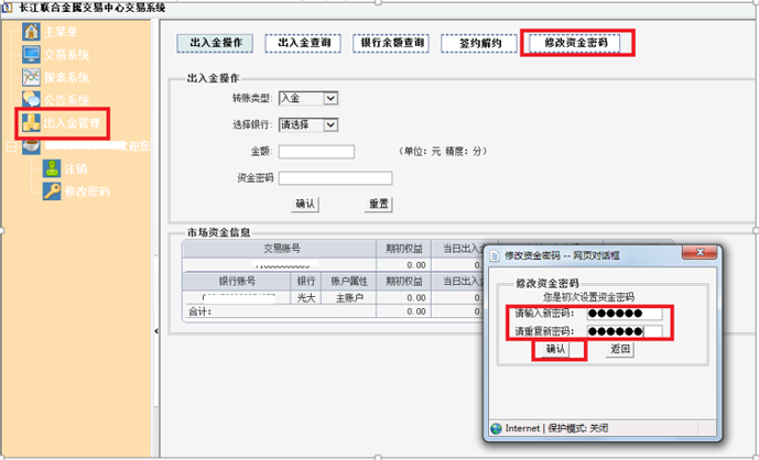 一、初次入金需要修改资金密码,登录客户端-出入金管理-修改资金密码,输入资金密码,点击“确定”按钮。
