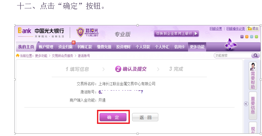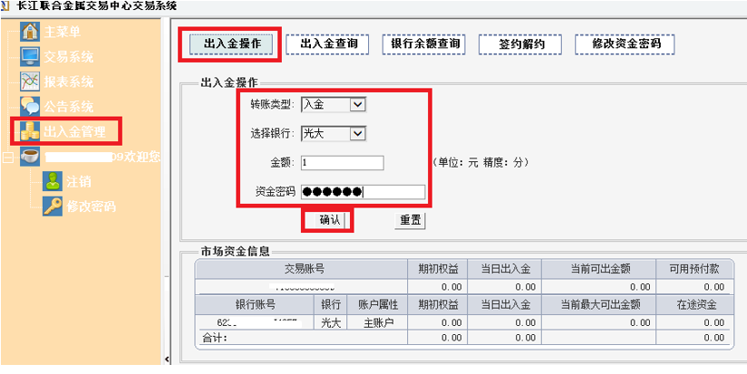三、选择:出入金操作,选择:入金,选择银行:光大,输入金额,密码,点击“确认”按钮。