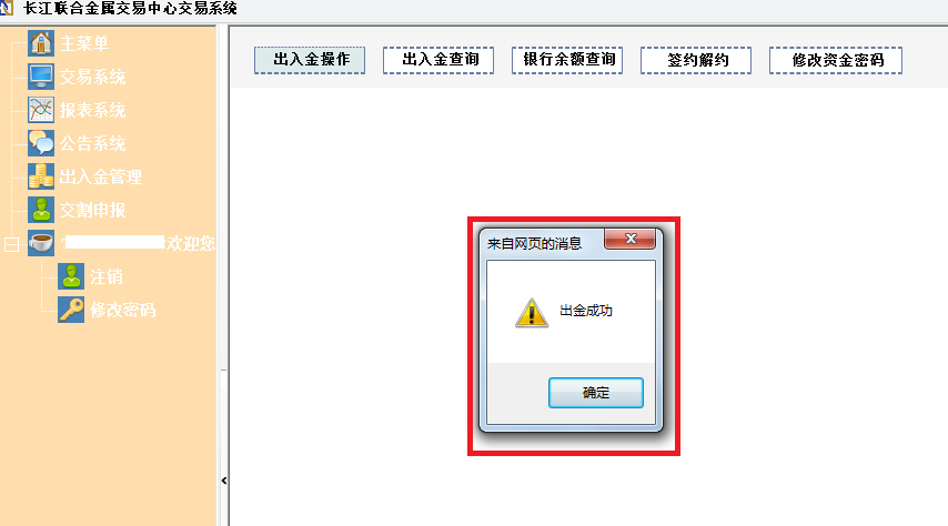三、显示出金成功,点击“确定”。
