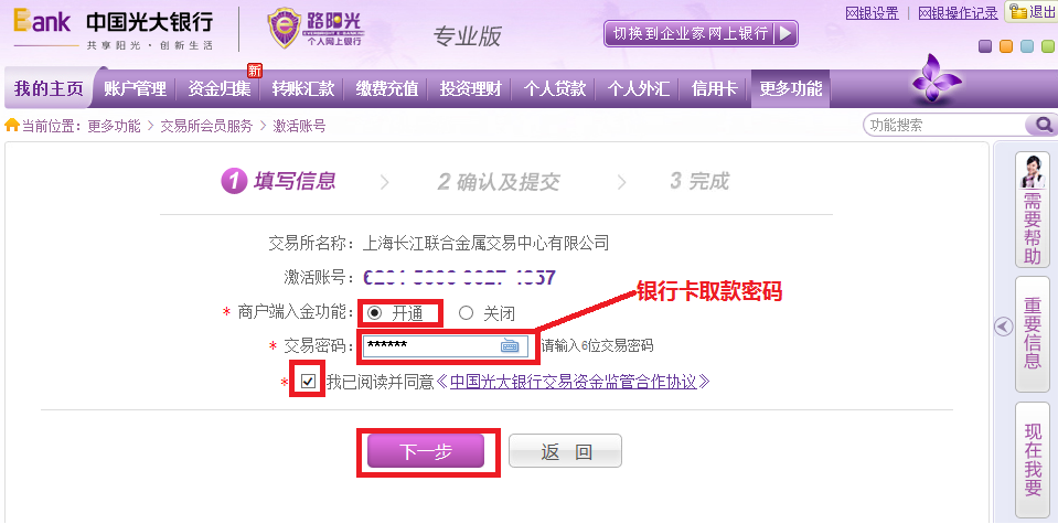 十一、选择商户端入金功能:开通,输入交易密码,点击“我同意”,点击:下一步。