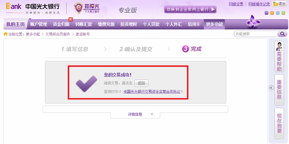 十三、显示操作成功,光大本行签约流程完成。