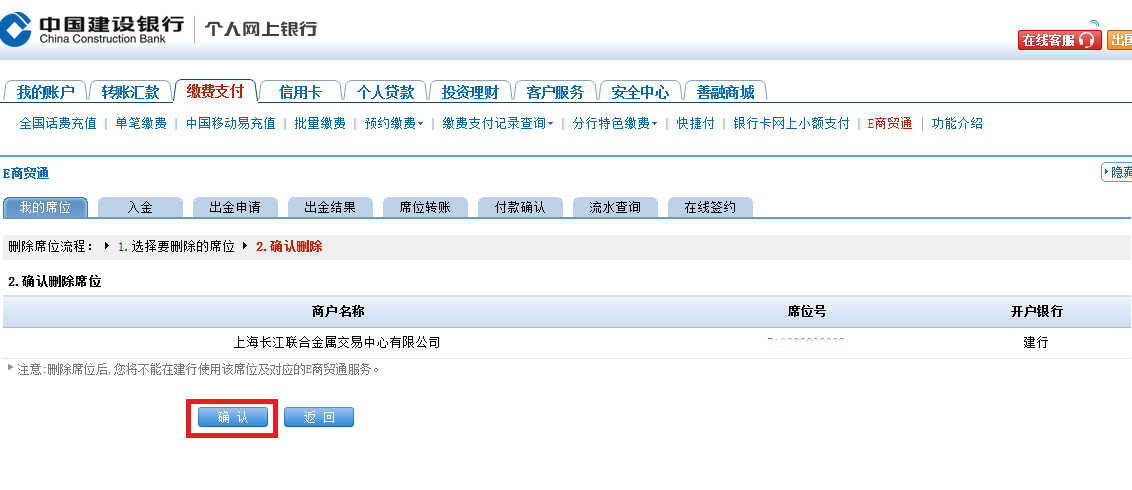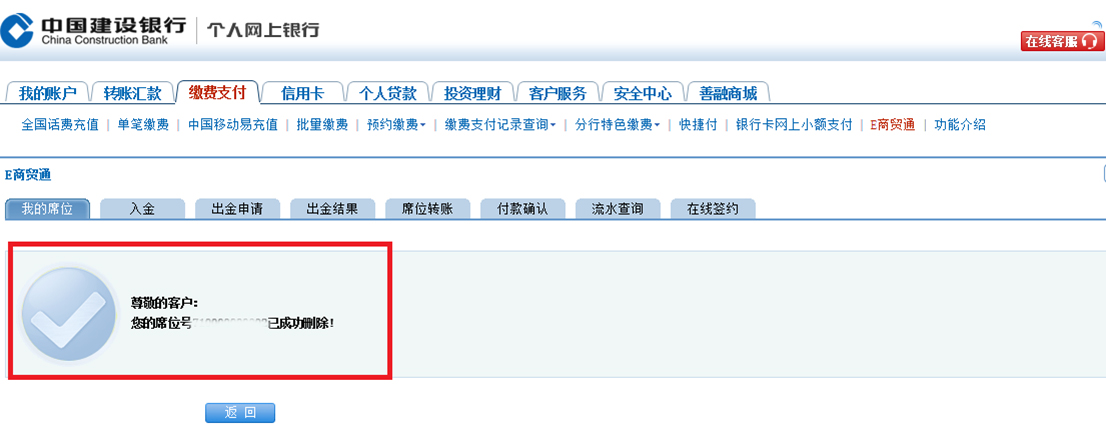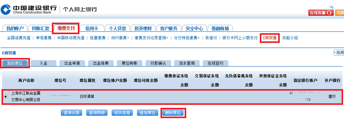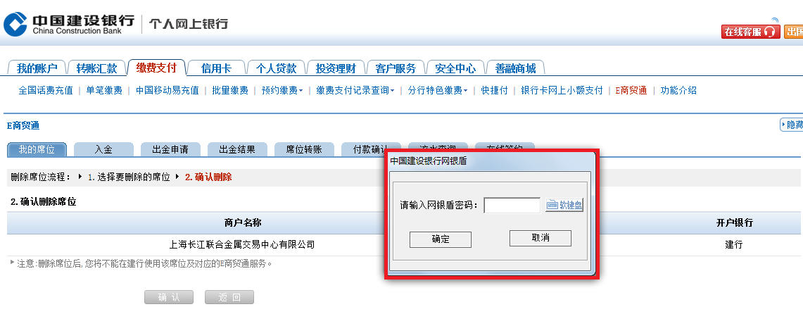 一、插入网银盾,登录建行个人网上银行,选择:缴费支付-我的席位,选择需要解约的账户,点击:删除席位。