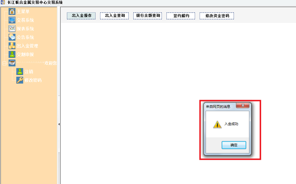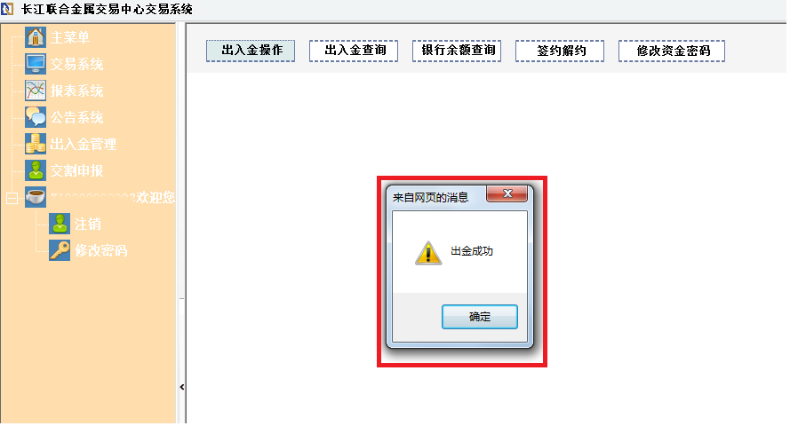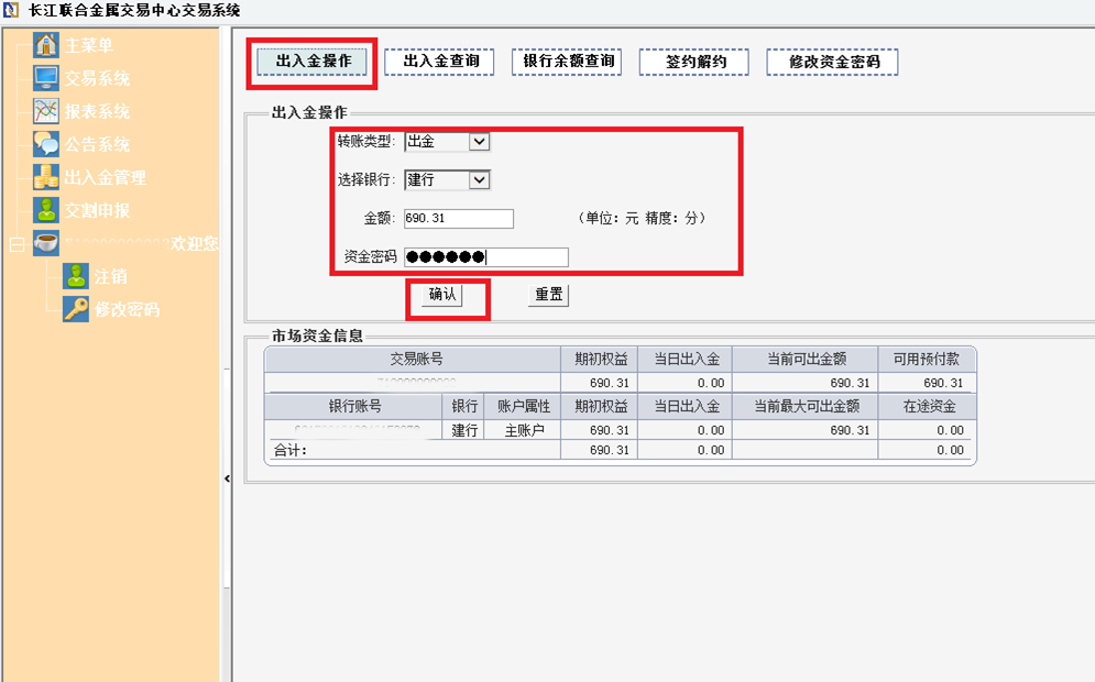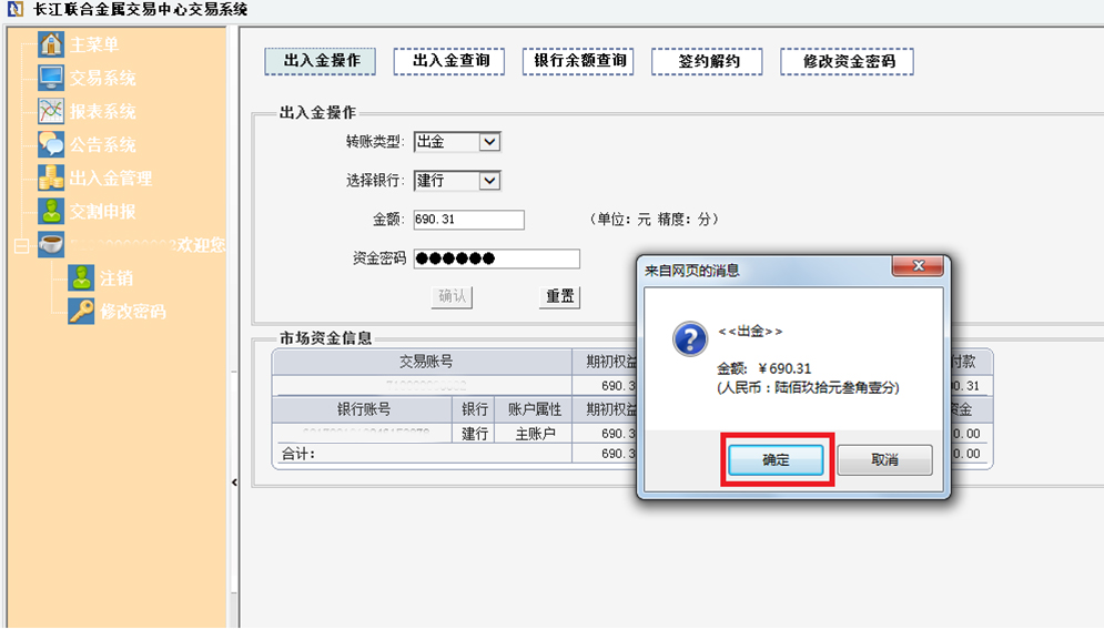 一、登录客户端-出入金操作,转账类型:出金,选择银行:建行,输入金额,密码,点击“确定”按钮。