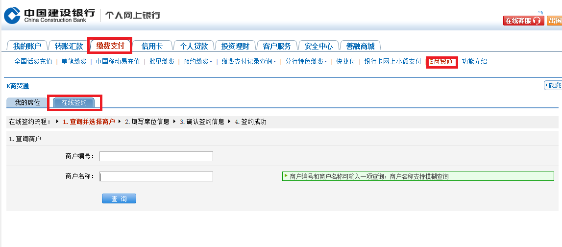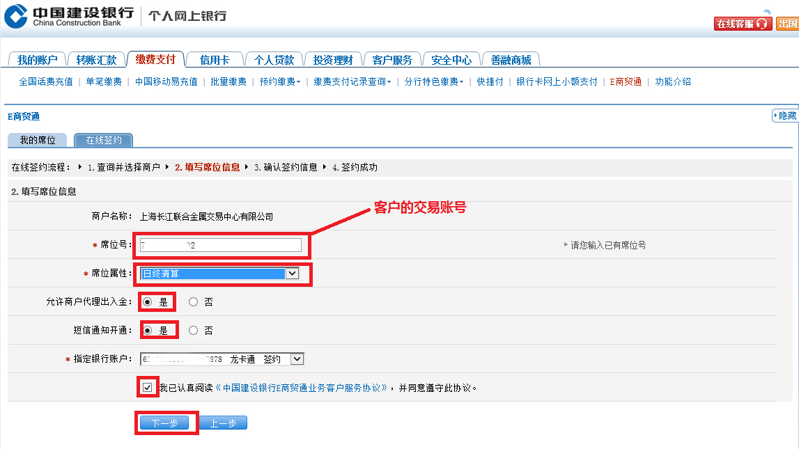 五、在商户名称中输入关键字:上海长江联合,点击“查询”按钮,选择商户“上海长江联合金属交易中心”,点击“下一步”。